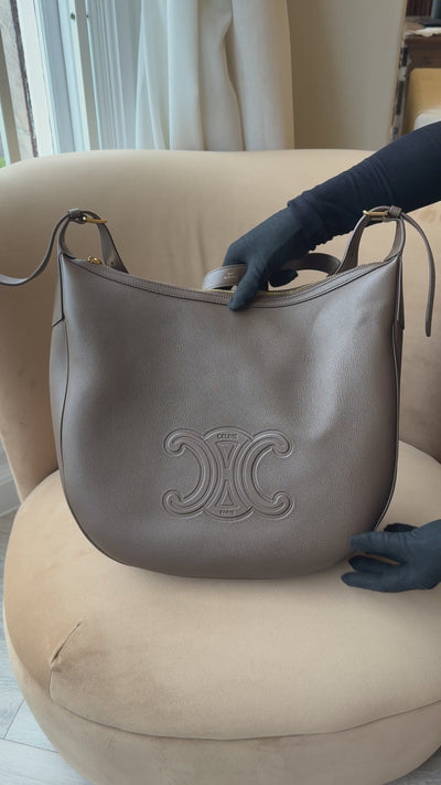 its suppleness gives it a relaxed spirit. its shape is distinguished by its refined lines and discreet hardware. the emblematic celine triomphe is revealed embossed in leather or printed on canvas. RRP £2,800.