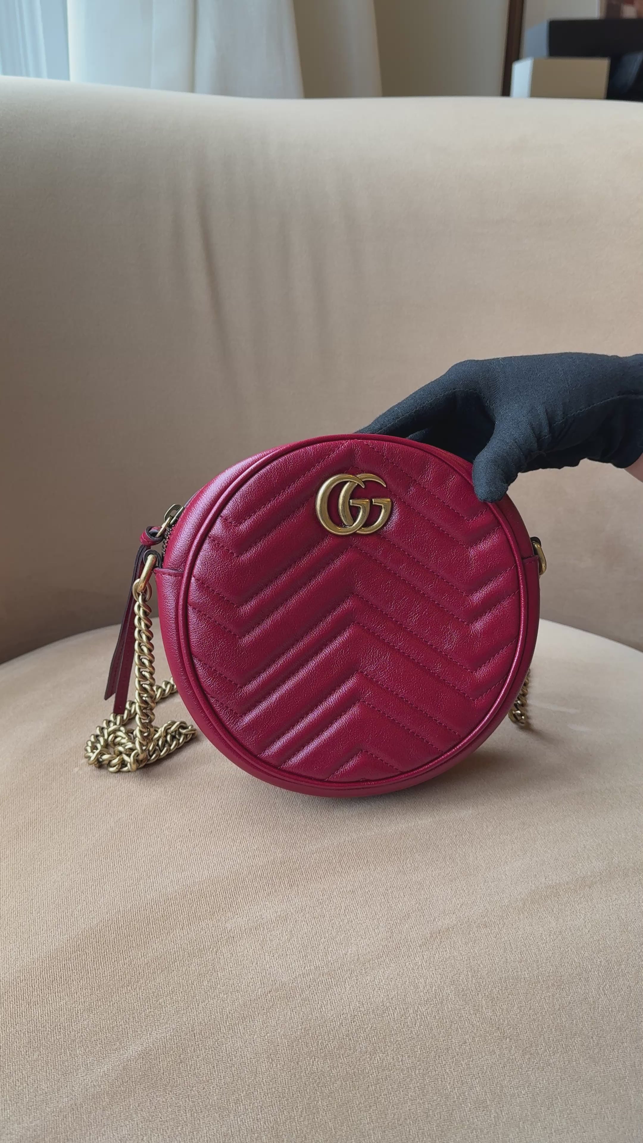 Accented with the instantly recognizable antique gold-tone Double G hardware, the round silhouette offers a modern yet timeless appeal. The adjustable leather strap allows for comfortable shoulder or crossbody wear, while the compact interior provides space for everyday essentials.