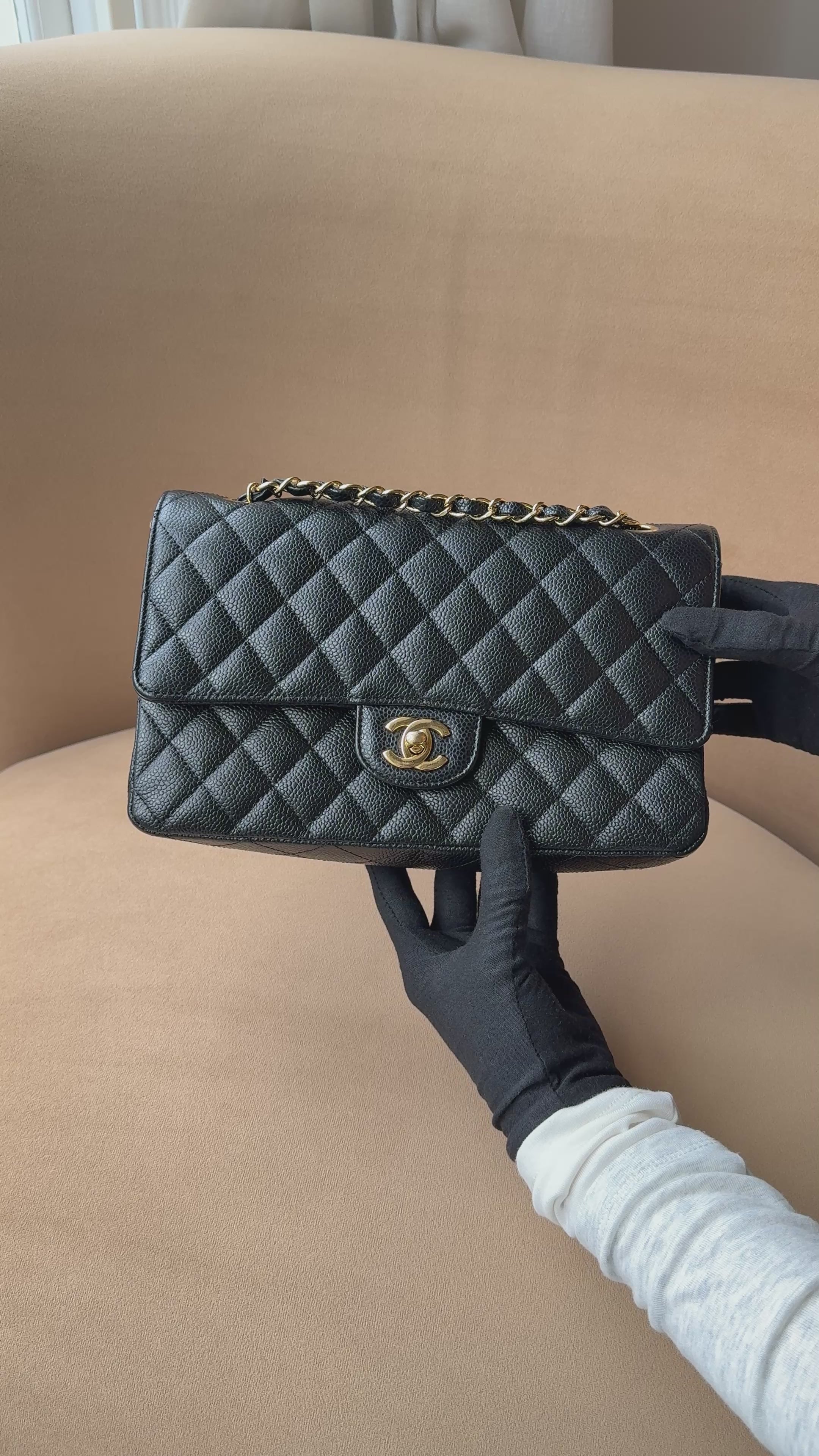 A timeless icon, reimagined in its most coveted form. This Chanel Medium Classic Double Flap bag is crafted from luxuriously durable black caviar leather, known for its signature pebbled texture and resistance to wear.