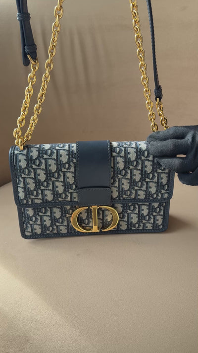 The 30 Montaigne line, inspired by the hallmark address, offers essential pieces that embody the House's iconic codes. The bag is crafted in blue jacquard and highlights the House's classic Dior Oblique motif for an elegant and modern design. The flap has an antique gold-finish metal CD clasp, inspired by the seal of a Christian Dior perfume bottle. Other details, like the embossed 30 Montaigne signature at the back, accent the streamlined design. Thanks to the chain strap, the bag can be carried by hand, worn over the shoulder or crossbody. There is light rubbing to the corners, light transfer to the inside opening material and light marks to the interior. Current RRP £2,900.